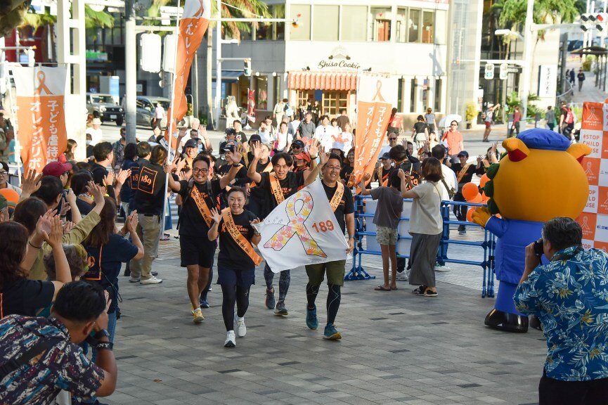 ゴールのパレットくもじ前交通広場までのコースをランナーが走り、児童虐待防止の象徴である「オレンジリボン運動」の関心を高めました。